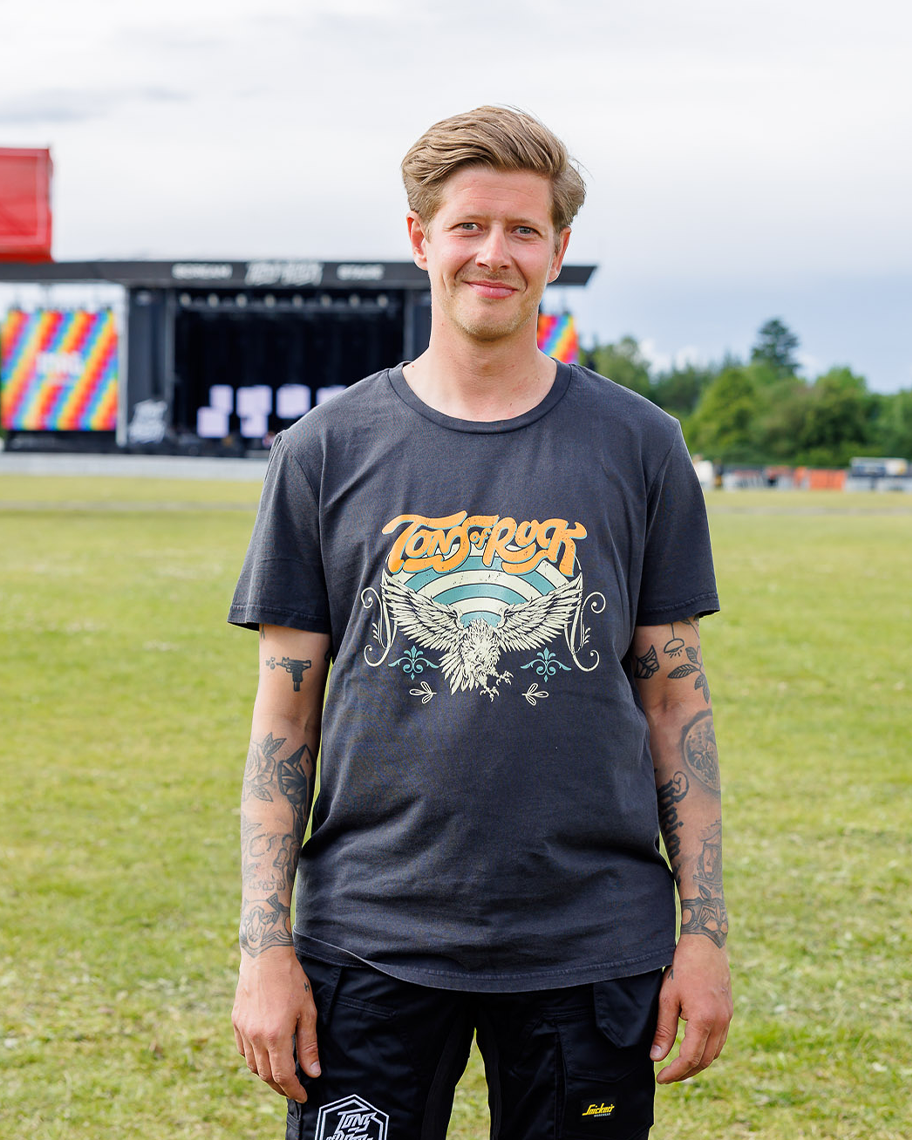 Denne vintage-inspirerte t-skjorta kombinerer en slitt, steinvasket look med et majestetisk ørnedesign og den klassiske Tons of Rock-logoen. Perfekt for deg som vil skille deg ut med stil på festival – eller hvor som helst ellers.